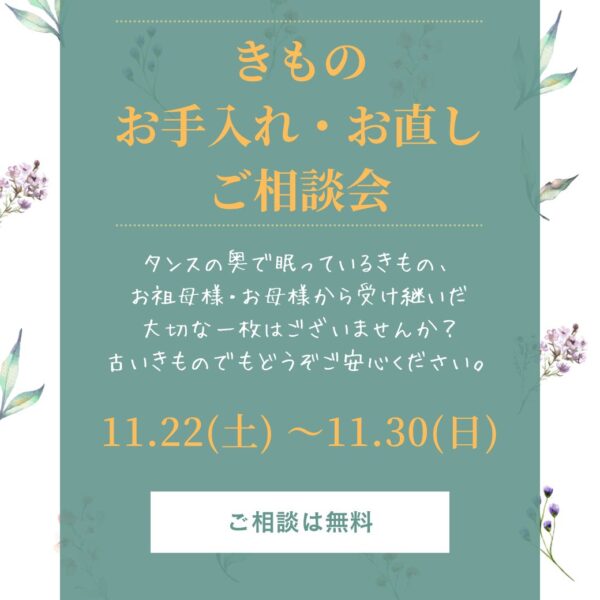 11月22日(土)~30日(日)、染織こうげい神戸店にて「きものお手入れ・お直しご相談会」を開催いたします。<11月25日(火)は定休日>