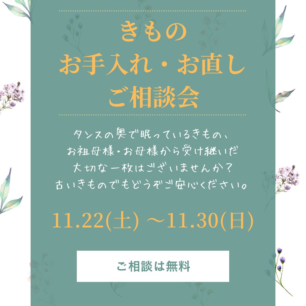 11月22日(土)~30日(日)、染織こうげい神戸店にて「きものお手入れ・お直しご相談会」を開催いたします。<11月25日(火)は定休日>