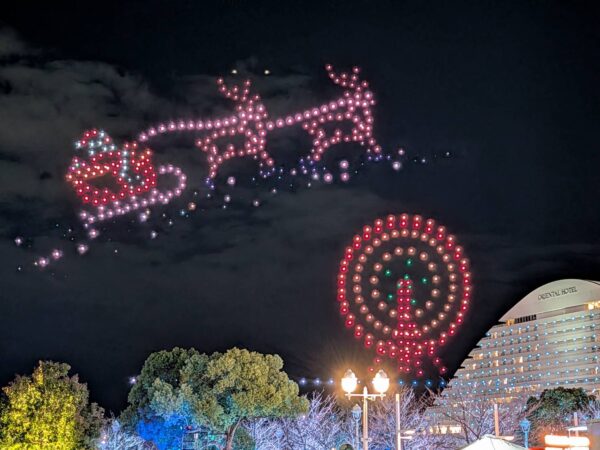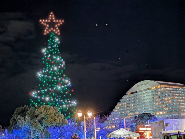 なかでも圧巻だったのが、音楽と連動して展開するドローンショー。夜空に無数の光が整列し、写真のように「Merry Christmas」の文字、雪の結晶や星、サンタのモチーフが次々と描かれていく様子は、まるで空に絵を描くようでした。大きなツリーのシルエットが立ち上がり、星がきらりと灯る瞬間には、思わず歓声が上がるほど。別の場面では、お菓子の人形やキャンディのような図柄も現れ、子どもから大人まで見入ってしまう可愛らしさも。ライトアップされた並木の青い光と建物の灯りが背景に溶け合い、写真以上に立体的で、温かな余韻が残ります。ドローンの光が波間に反射して、海そのものがイルミネーションの一部になったように感じられたのも印象的でした。