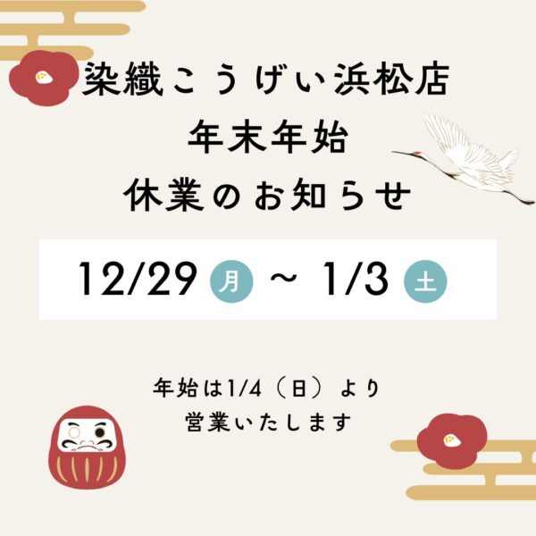 浜松店|年末年始休業のお知らせ 活動日記 2025.12.26 平素より染織こうげい浜松店をご愛顧いただき、誠にありがとうございます。 誠に勝手ながら、染織こうげい浜松店は下記期間を年末年始休業とさせていただきます。 【年末年始休業期間】2025年12月29日(月)~2026年1月3日(土) 新年は1月4日(日)より通常営業いたします。 本年も多くのお客様にご来店いただき、心より御礼申し上げます。 来年も皆さまに喜んでいただけるよう努めてまいりますので、変わらぬご愛顧のほど、何卒よろしくお願い申し上げます。