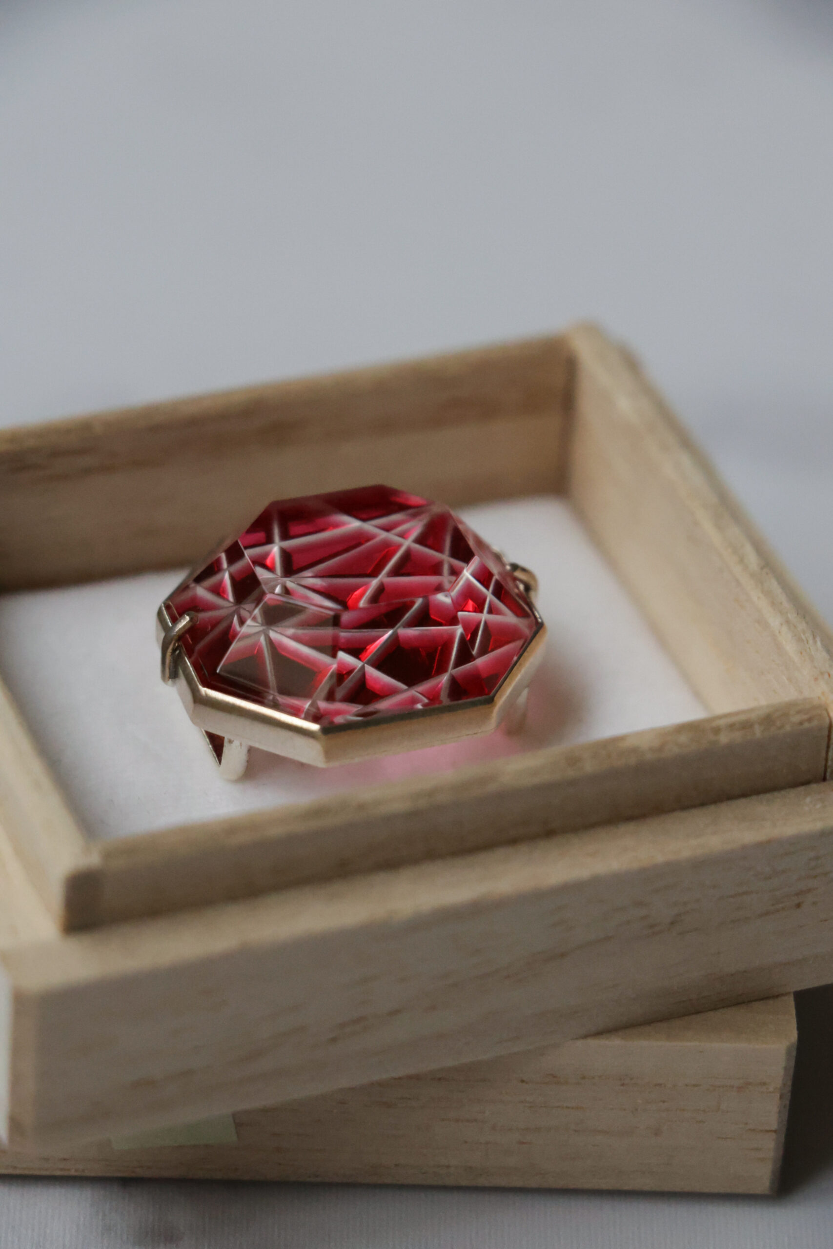 江戸切子作家・小川郁子さんによる帯留は、繊細な紋様が幾重にも重なり、光を受けるたびに豊かな表情を生み出します。師・小林英夫氏ゆずりの確かな技術に加え、小川さんならではの色ガラスの重なりやカットのリズムが際立ち、まるで宝石のような奥行きと輝きを感じさせます。八角形のフォルムに刻まれたシャープなラインは、凛とした存在感を放ちながら、和装の上で上品なアクセントに。