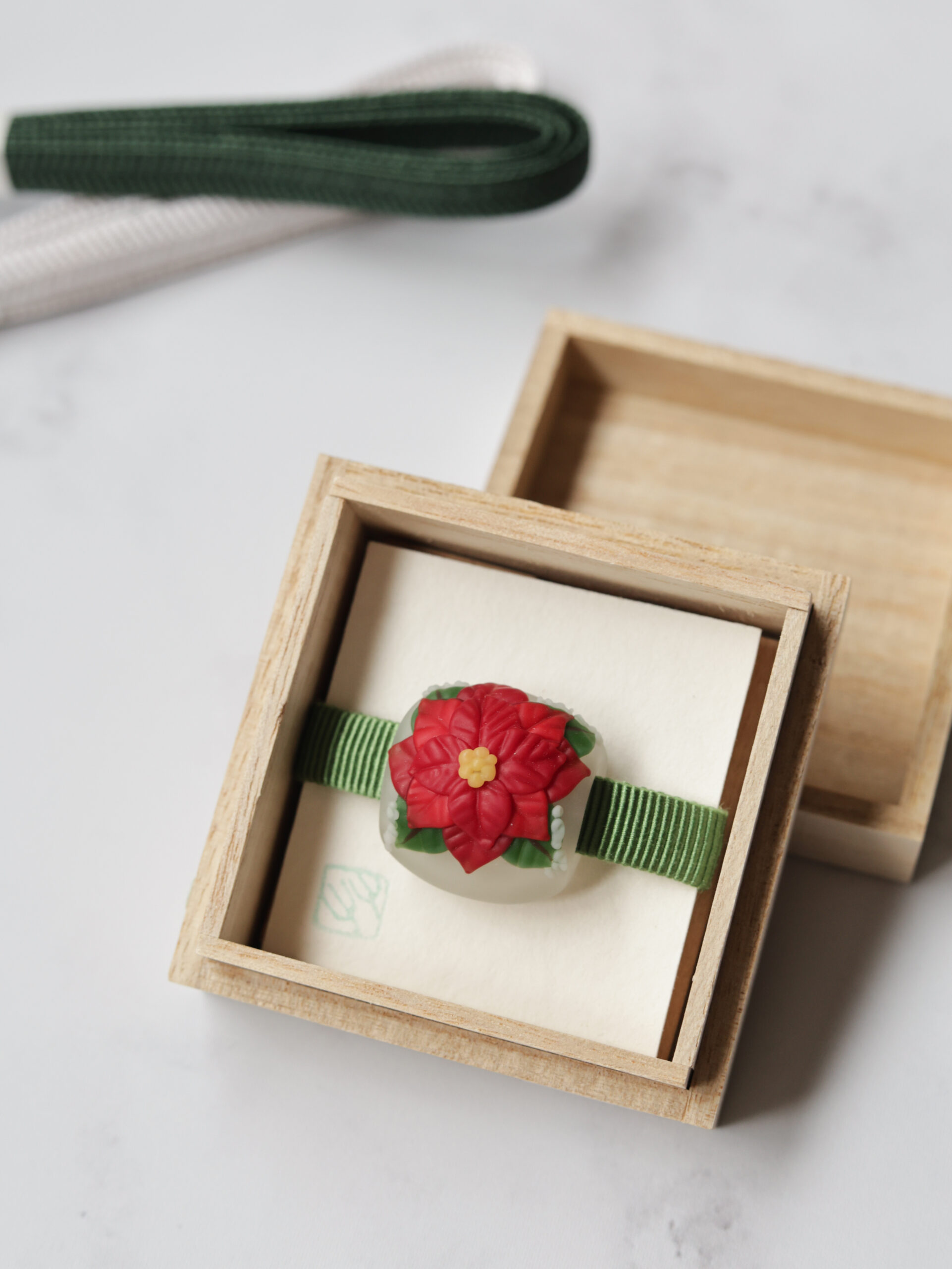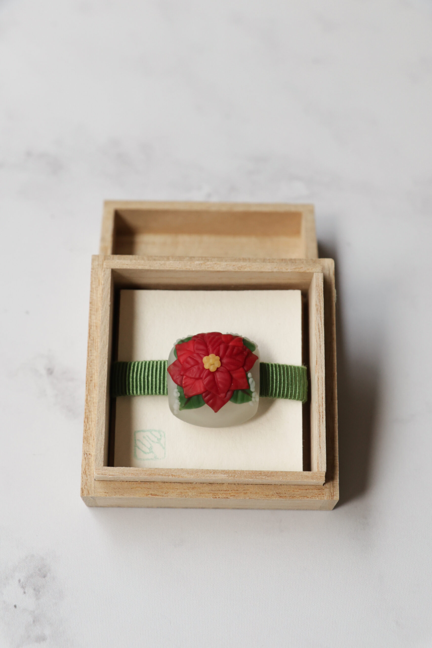 ポインセチアの花言葉は「祝福する」。大切な人を思う気持ちや、幸運を祈る想いが自然と重なり、帯留として身につけることで装いにも優しい華やぎが添わります。川北さんの繊細な感性と熟練の技によって仕上げられたこの作品は、クリスマスシーズンのきもの姿を特別に演出する、小さなアートピースです。