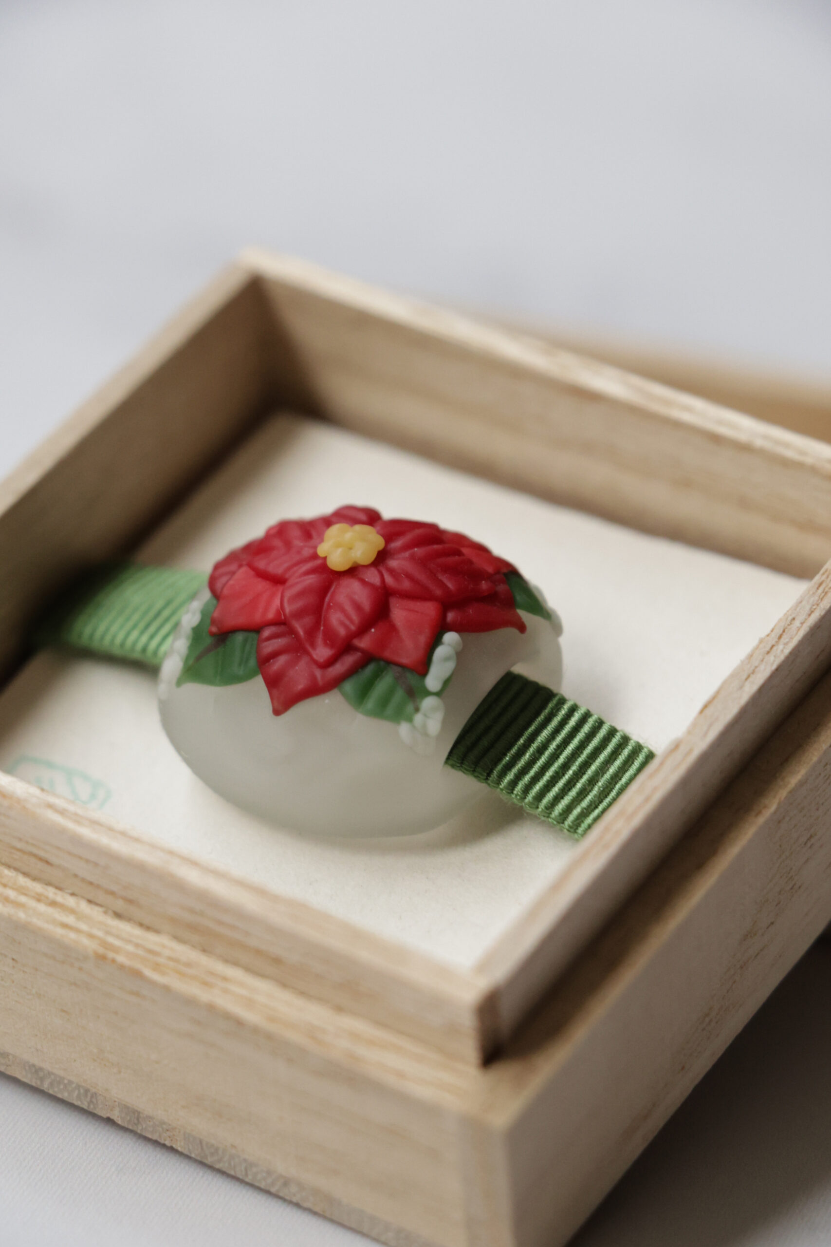 工房「イフウ」のガラス作家・川北友香さんが手がけた、とんぼ玉の帯留です。クリスマスを象徴する赤いポインセチアをモチーフに、聖夜の静かな輝きをガラスの中に閉じ込めたかのようなデザインが魅力。花びら一枚一枚の立体感や、葉の深い緑とのコントラストが見事で、見つめるほどに温かな光を感じさせます。