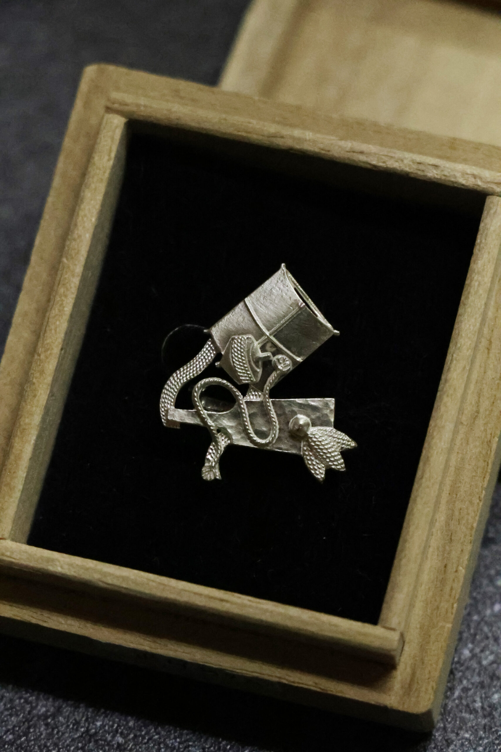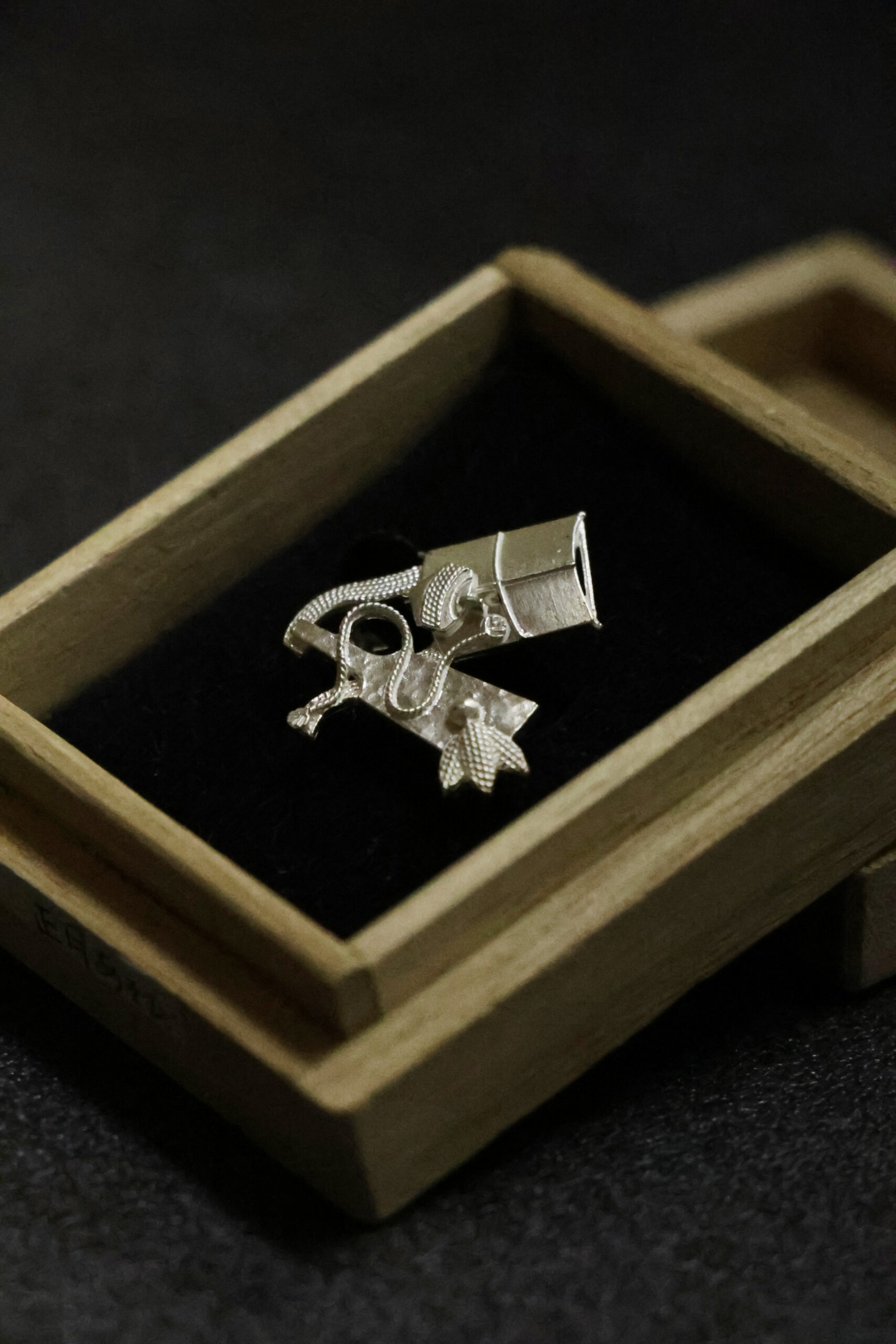 【NEW】松原智仁 帯留「正月遊び」 松原智仁氏による、銀線細工の妙技が冴える帯留です。 模様に合わせて銀線を巻き上げ、丁寧に溶接して仕上げる技法には、松原氏特有の端正な美意識が息づいています。 本作には、羽子板・こま・凧上げといった懐かしい正月遊びの情景が重なり、新春の穏やかな高揚感が漂います。 緻密な工芸性と、身に着ける人へ寄り添う温かみを併せ持つ点も魅力。正月の晴れの日や節目の装いに、小さく確かな輝きを添える逸品です。 カテゴリ 小物(帯留) 作家名 松原智仁 取扱商品一覧へ 前の記事 次の記事