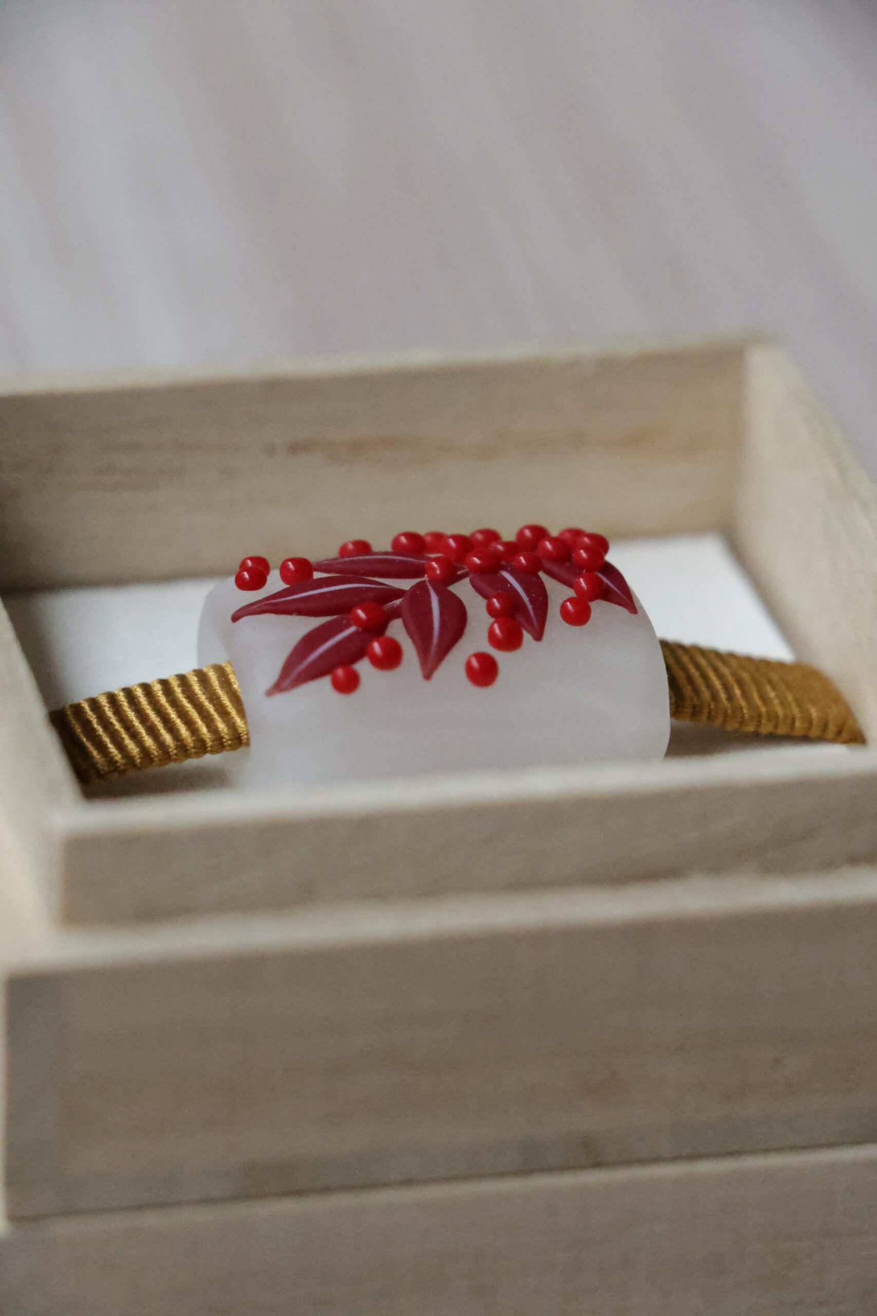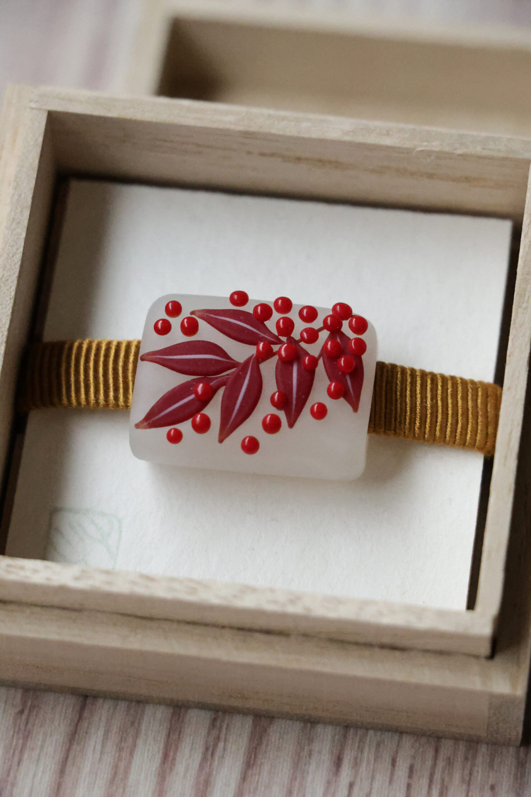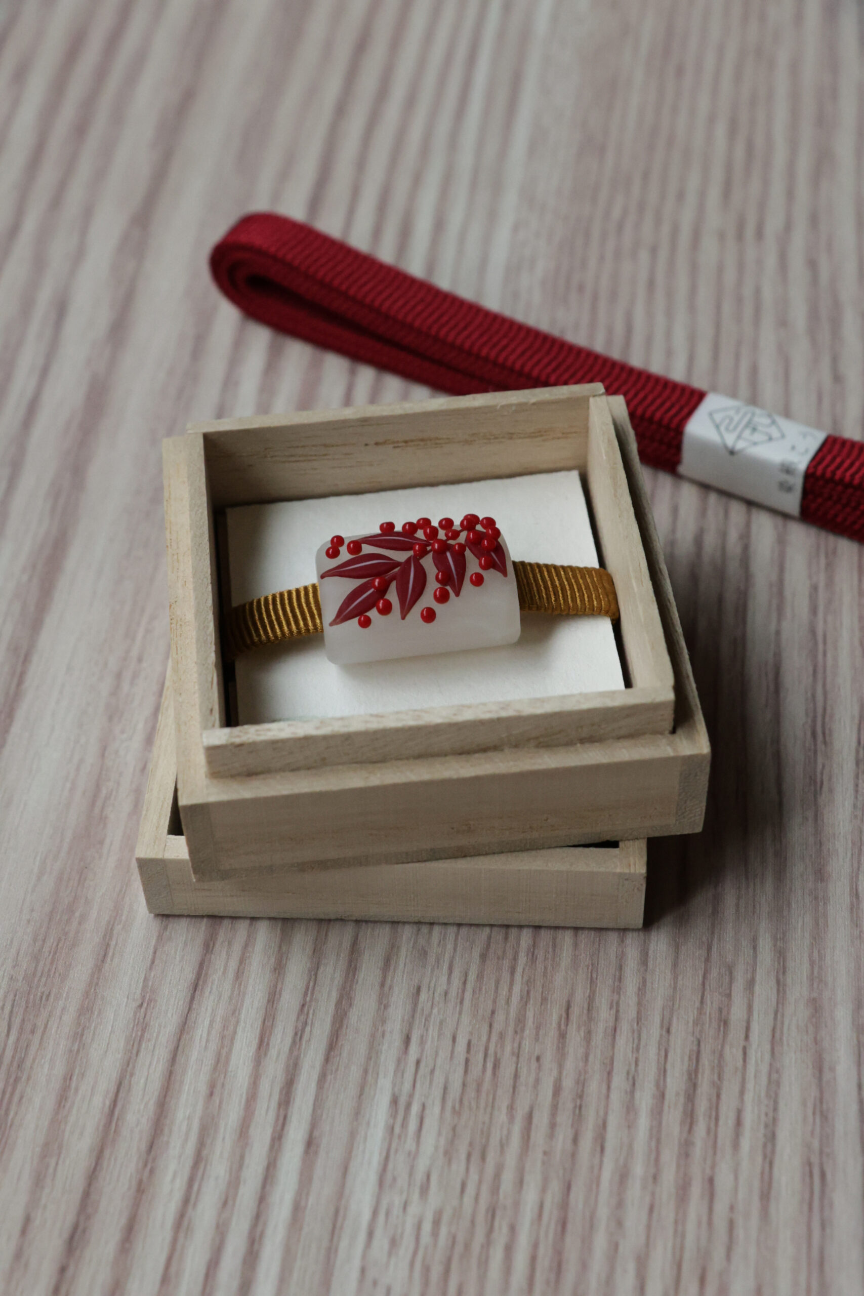 師である大鎌康弘氏から受け継いだ高度な技術をもとに、南天の実と葉をガラスの中に閉じ込めた意匠は、立体感と透明感が共存する小さな世界のよう。