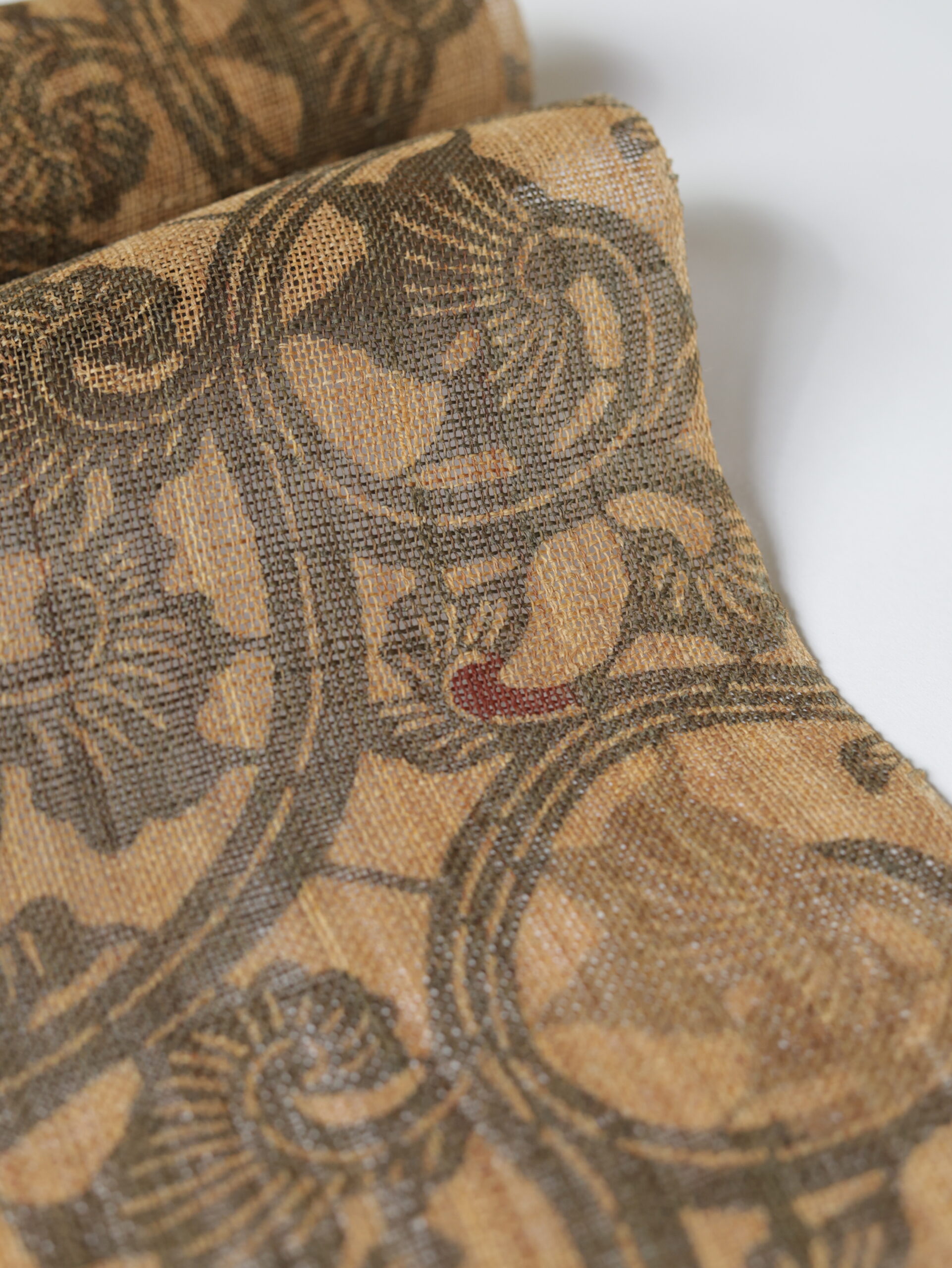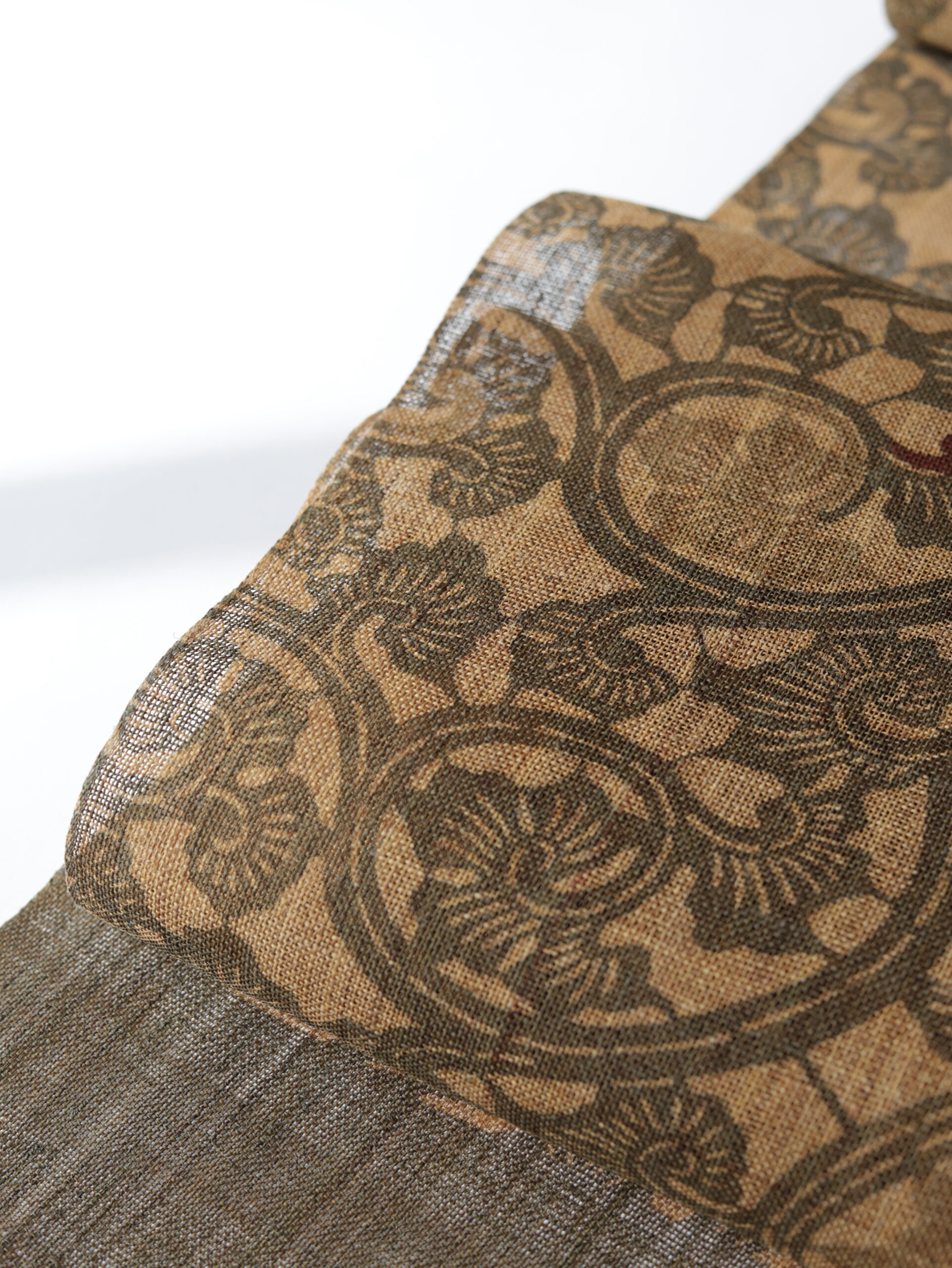 この力強い地組織に施されたのは、伝統的な「松煙染」です。 松の脂分から生じる煤(すす)を膠(にかわ)で丹念に練り、豆汁(ごじる)と混ぜ合わせて染めるこの技法は、化学染料には出せない独特の深みと、沈んだ墨色の濃淡を生み出します。型染めによって浮かび上がる「宝相華唐草紋」は、科布のザラりとした質感と相まって、立体的かつ神秘的な表情を放ちます。